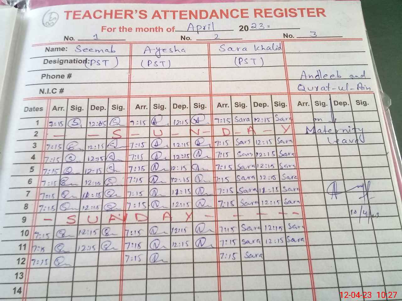| 37**** | An**** Ra**** | PST | Regular | 14 | 0 | 0 | 14 | 0 | 0 | 0 | 0 | 0 | Maternity |