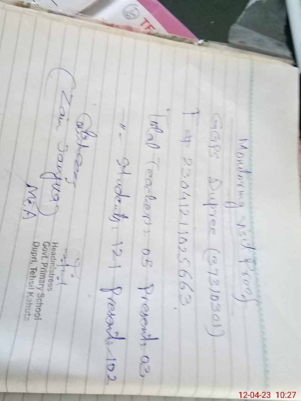 | Attendance Register | Head Teacher | MEA with School | Visit Proof |