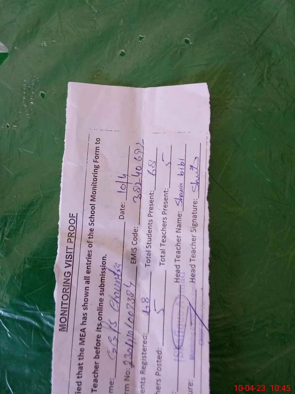 | Attendance Register | Head Teacher | MEA with School | Visit Proof |