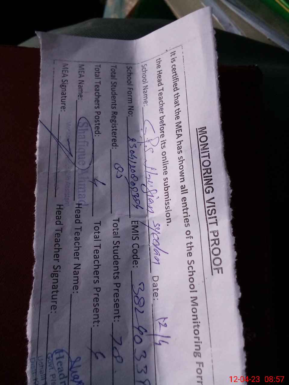 | Attendance Register | Head Teacher | MEA with School | Visit Proof |