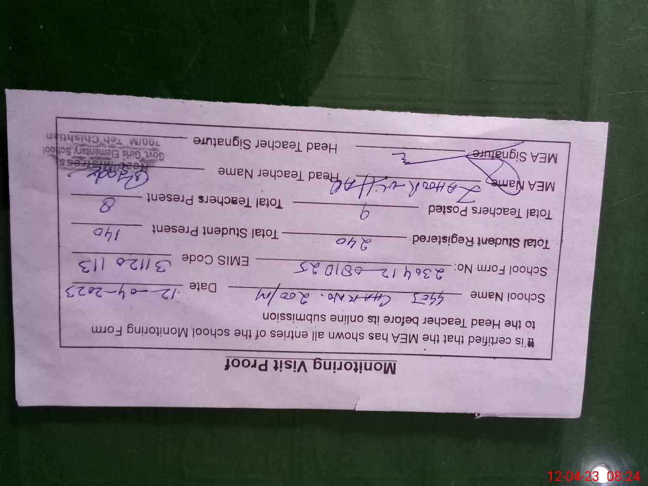 | Attendance Register | Head Teacher | MEA with School | Visit Proof |