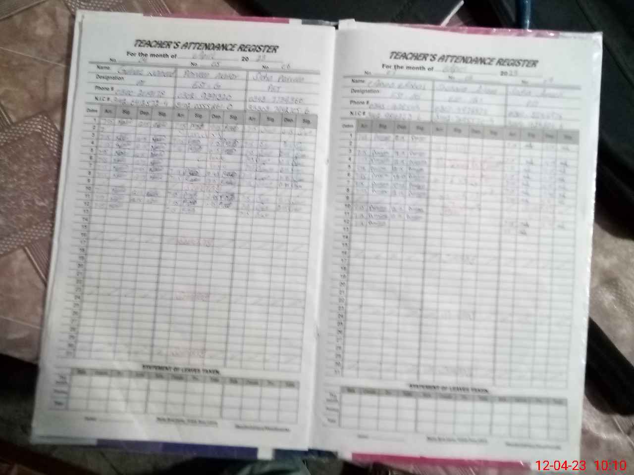 | CNIC | Full Name | Designation | R/C | Absence During Last Calender Month |