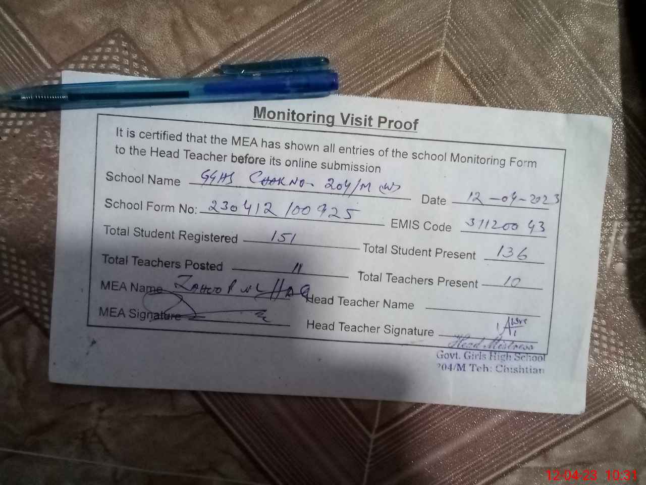 | Attendance Register | Head Teacher | MEA with School | Visit Proof |