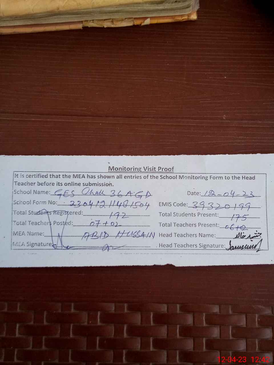 | Attendance Register | Head Teacher | MEA with School | Visit Proof |