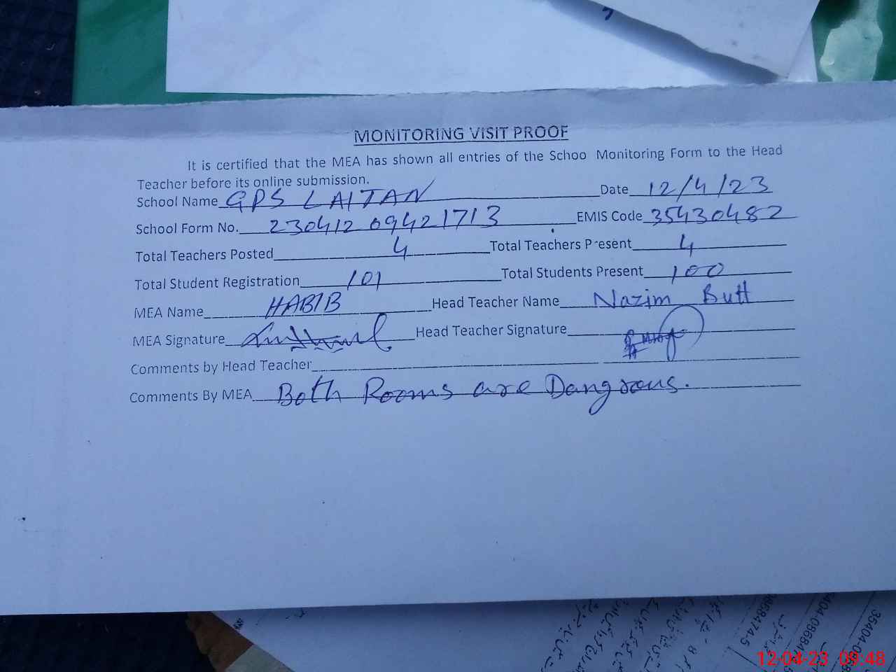 | Attendance Register | Head Teacher | MEA with School | Visit Proof |