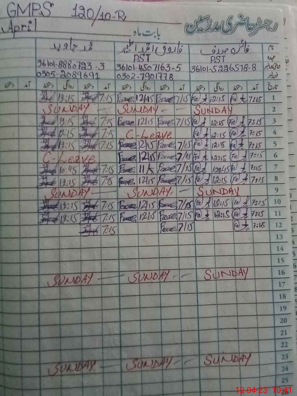 | CNIC | Full Name | Designation | R/C | Absence During Last Calender Month |