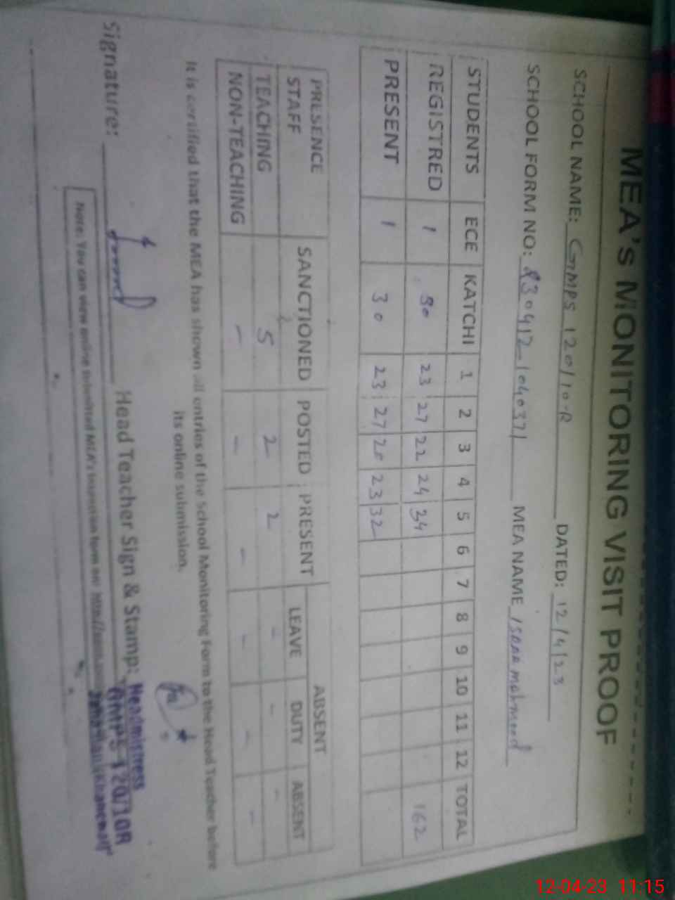 | Attendance Register | Head Teacher | MEA with School | Visit Proof |