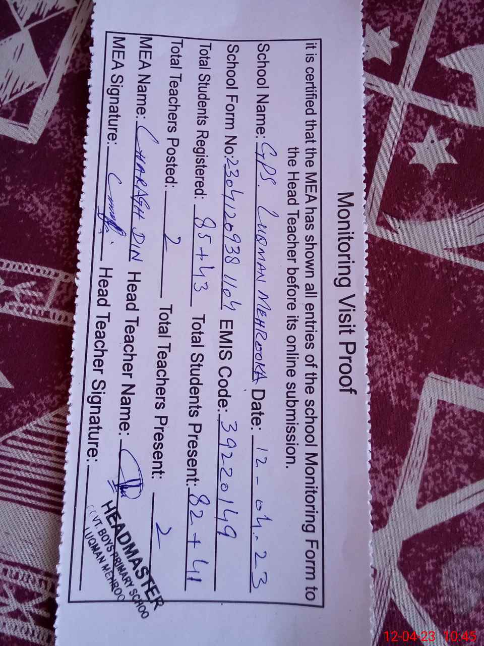 | Attendance Register | Head Teacher | MEA with School | Visit Proof |