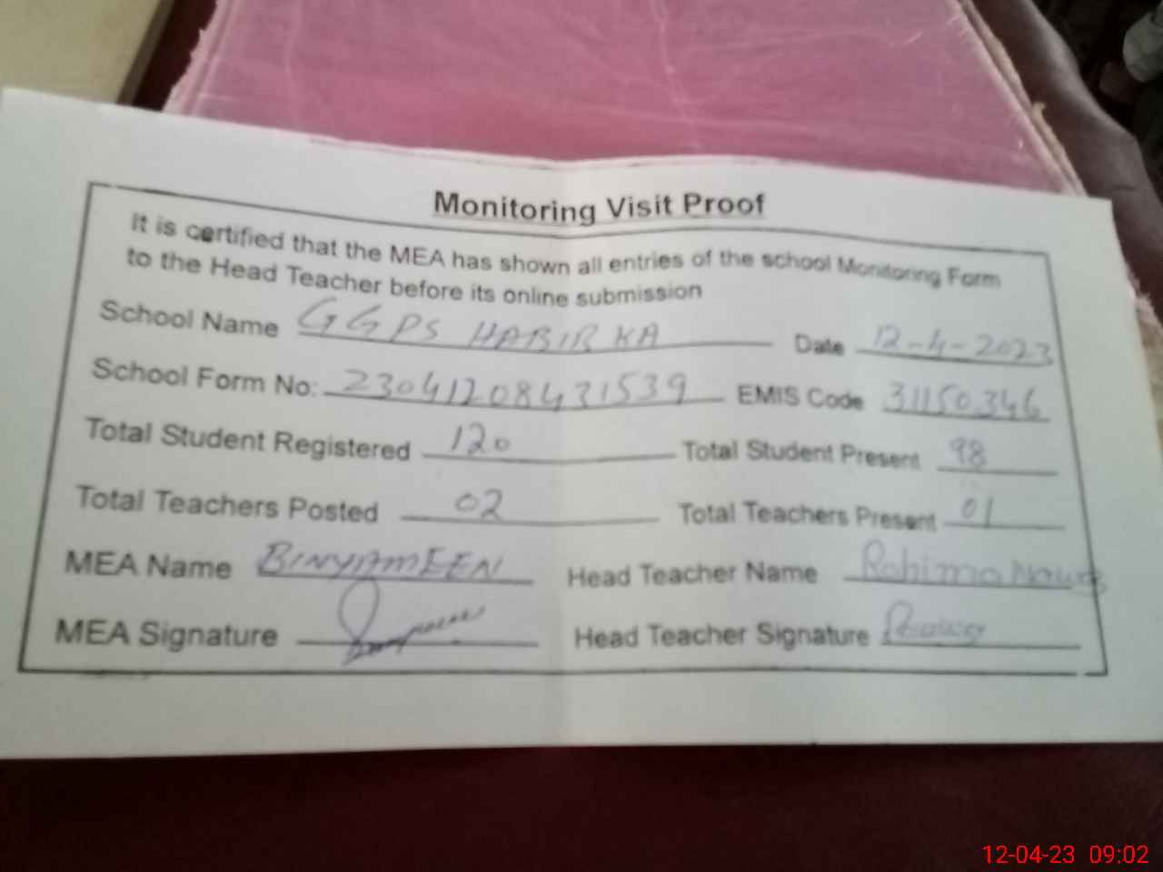 | Attendance Register | Head Teacher | MEA with School | Visit Proof |