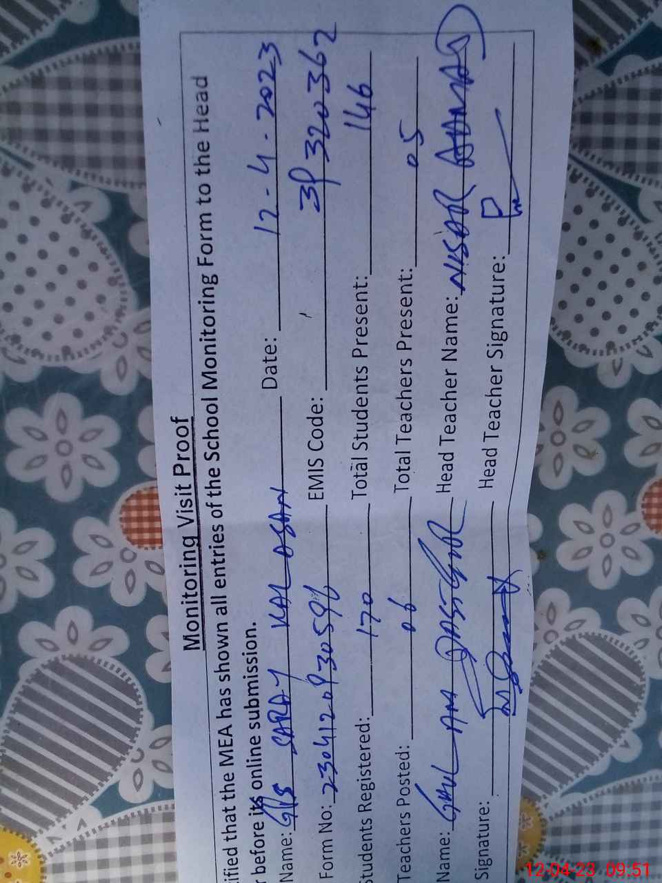 | Attendance Register | Head Teacher | MEA with School | Visit Proof |