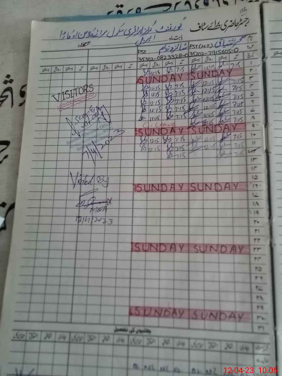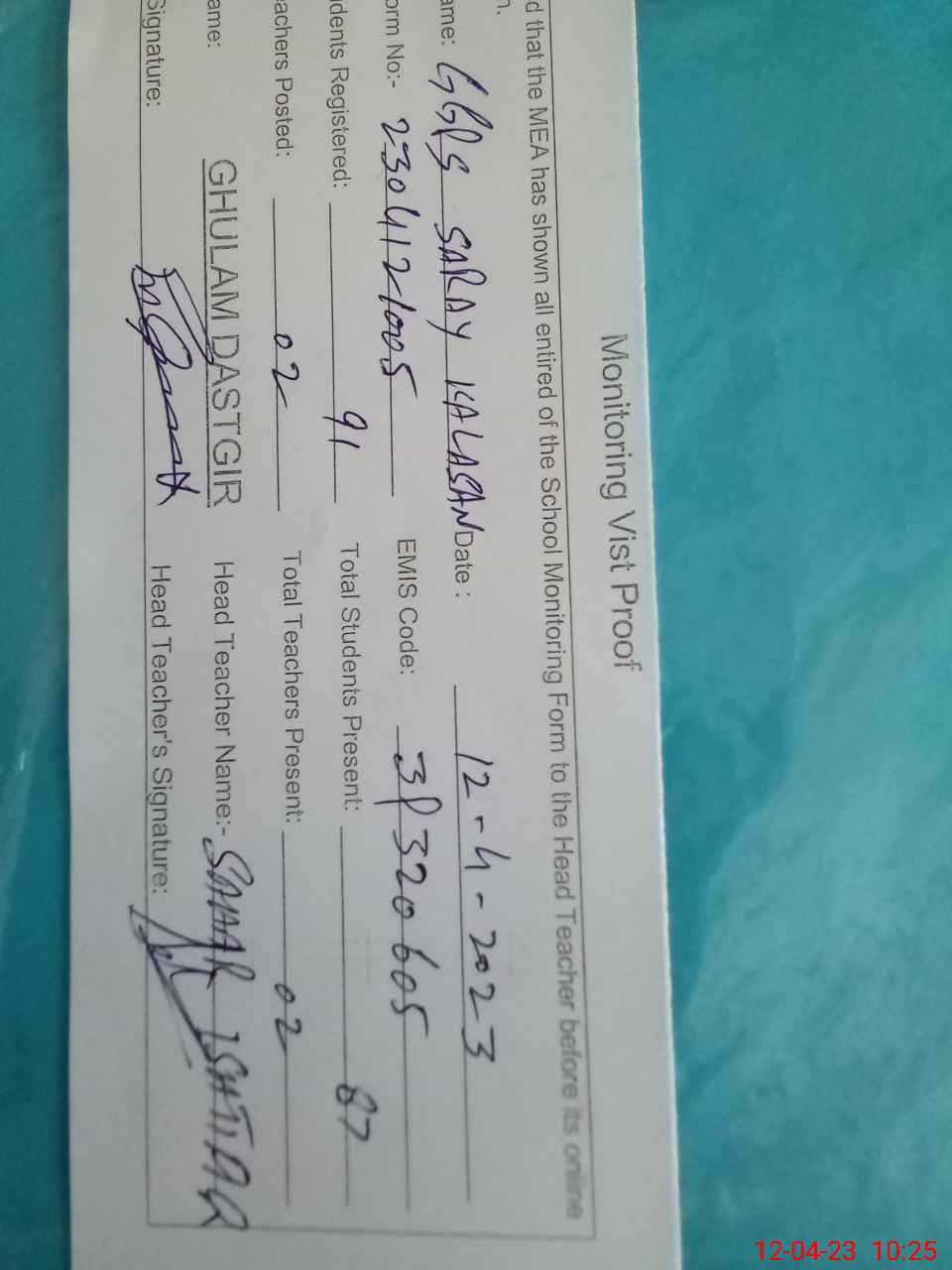 | Attendance Register | Head Teacher | MEA with School | Visit Proof |