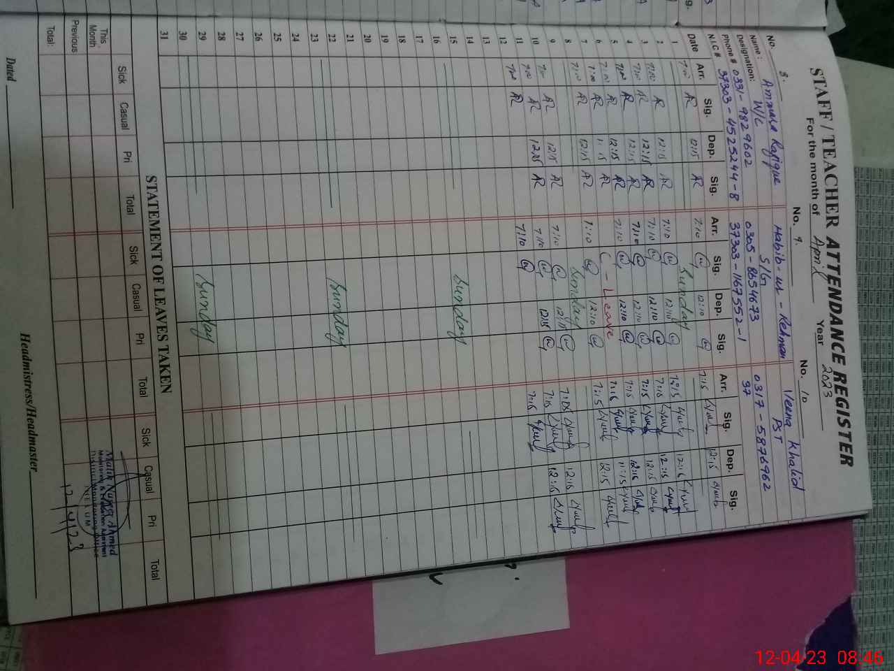 | Name: Gh**** An**** Designation: (School Headmaster's/Headmistress's) PRINCIPAL Phone/Cell Number: 03**** |