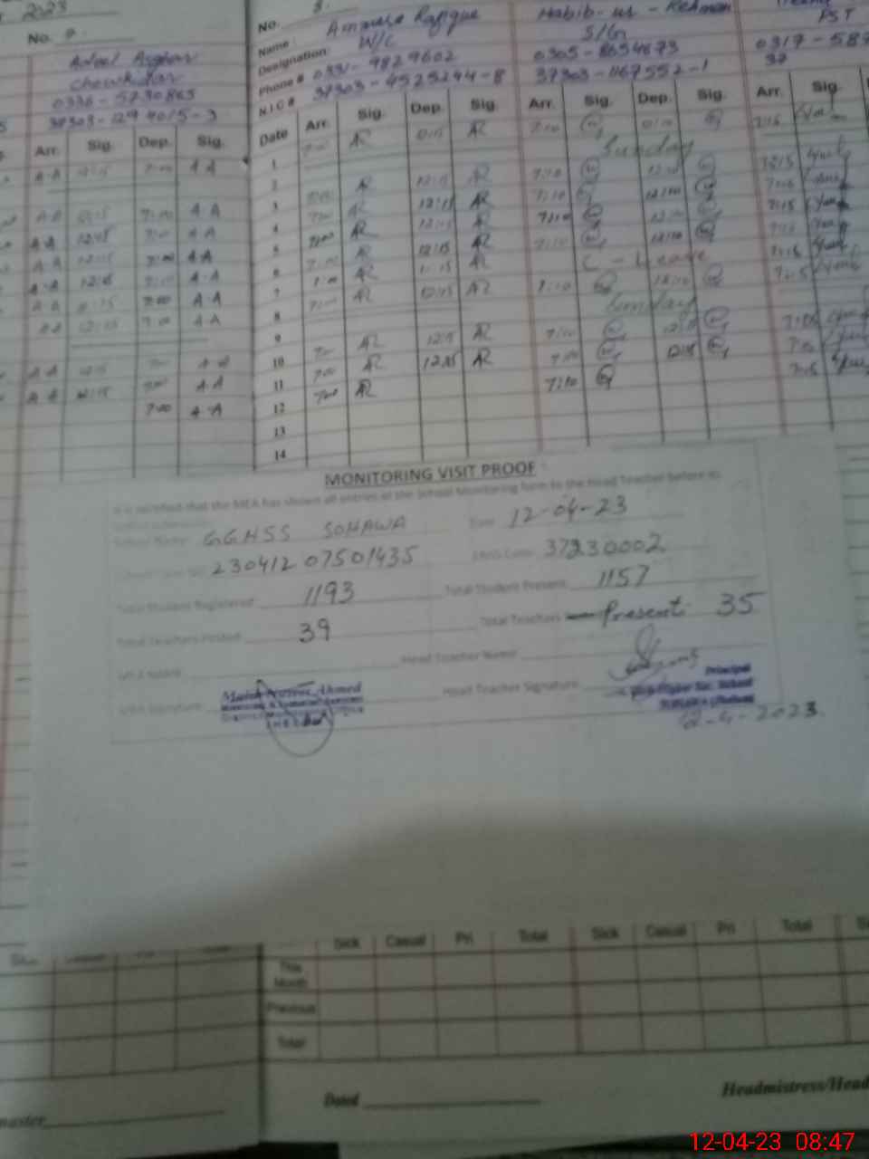 | Attendance Register | Head Teacher | MEA with School | Visit Proof |