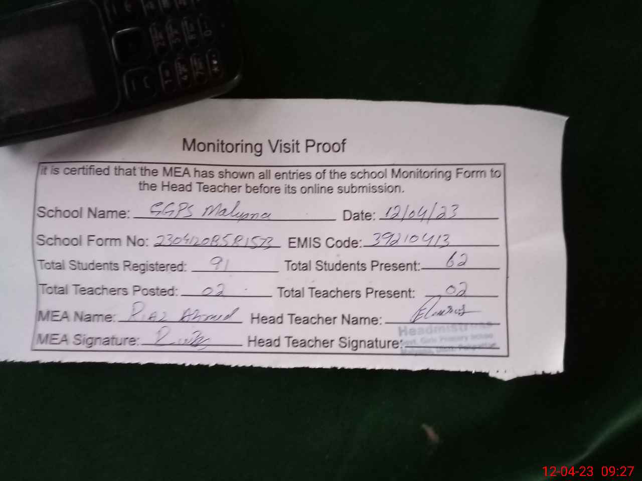 | Attendance Register | Head Teacher | MEA with School | Visit Proof |