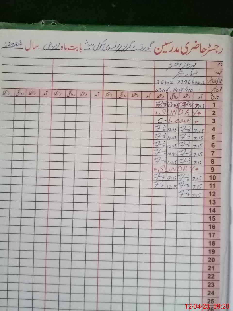 | CNIC | Full Name | Designation | R/C | Absence During Last Calender Month |