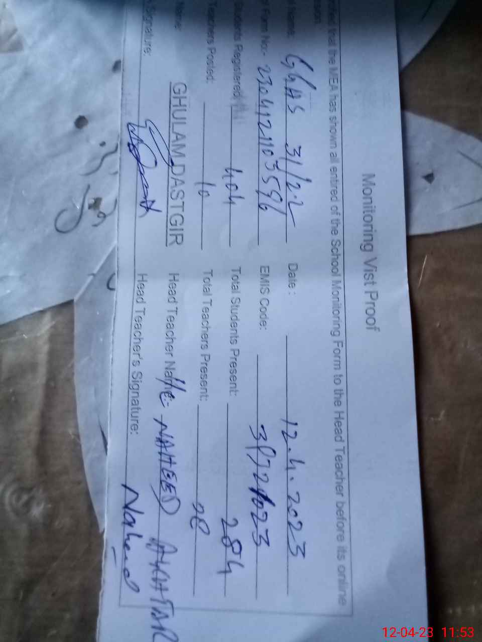 | Attendance Register | Head Teacher | MEA with School | Visit Proof |