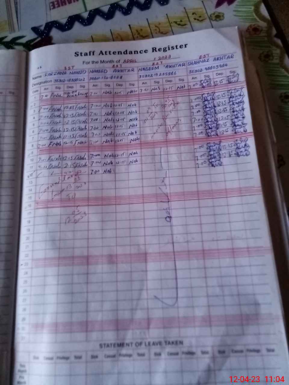 | CNIC | Full Name | Designation | R/C | Absence During Last Calender Month |