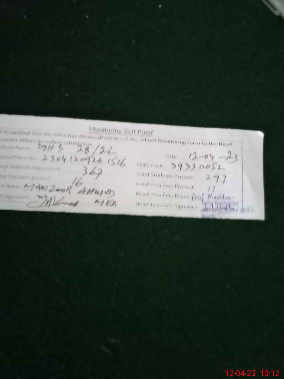 | Attendance Register | Head Teacher | MEA with School | Visit Proof |