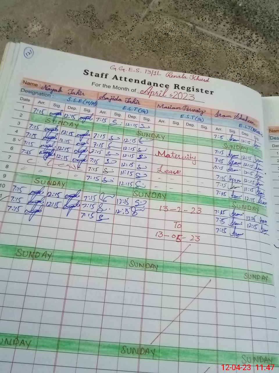 | Leave | Duty | Absent | Maternity | Medical | Ex- Pak |