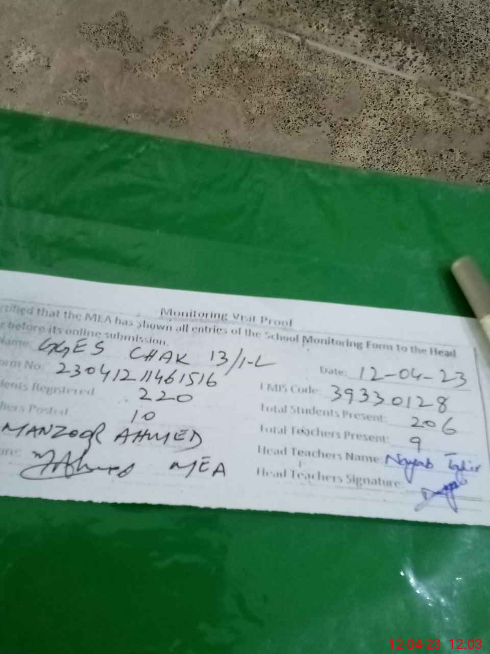 | Attendance Register | Head Teacher | MEA with School | Visit Proof |