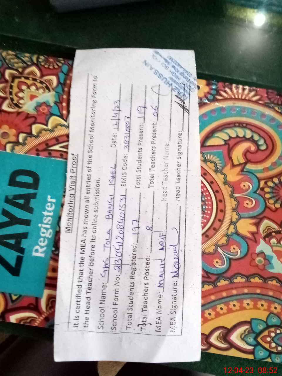 | EMIS Code: 38310007 | Name of School: GHS TOLA BANGI KHEL | |||