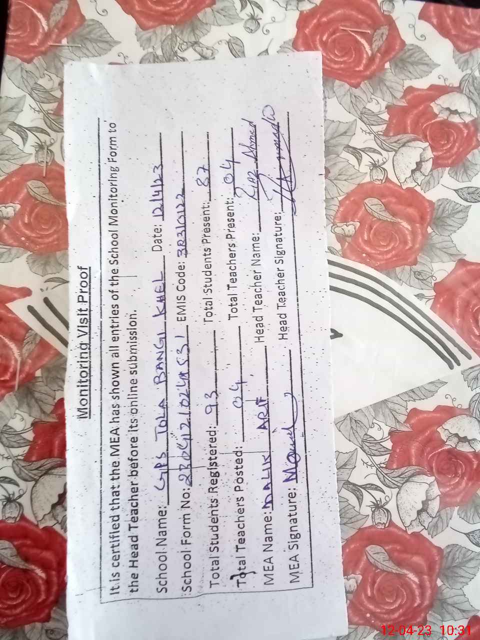| EMIS Code: 38310122 | Name of School: GPS TOLA BANGE KHEL | |||