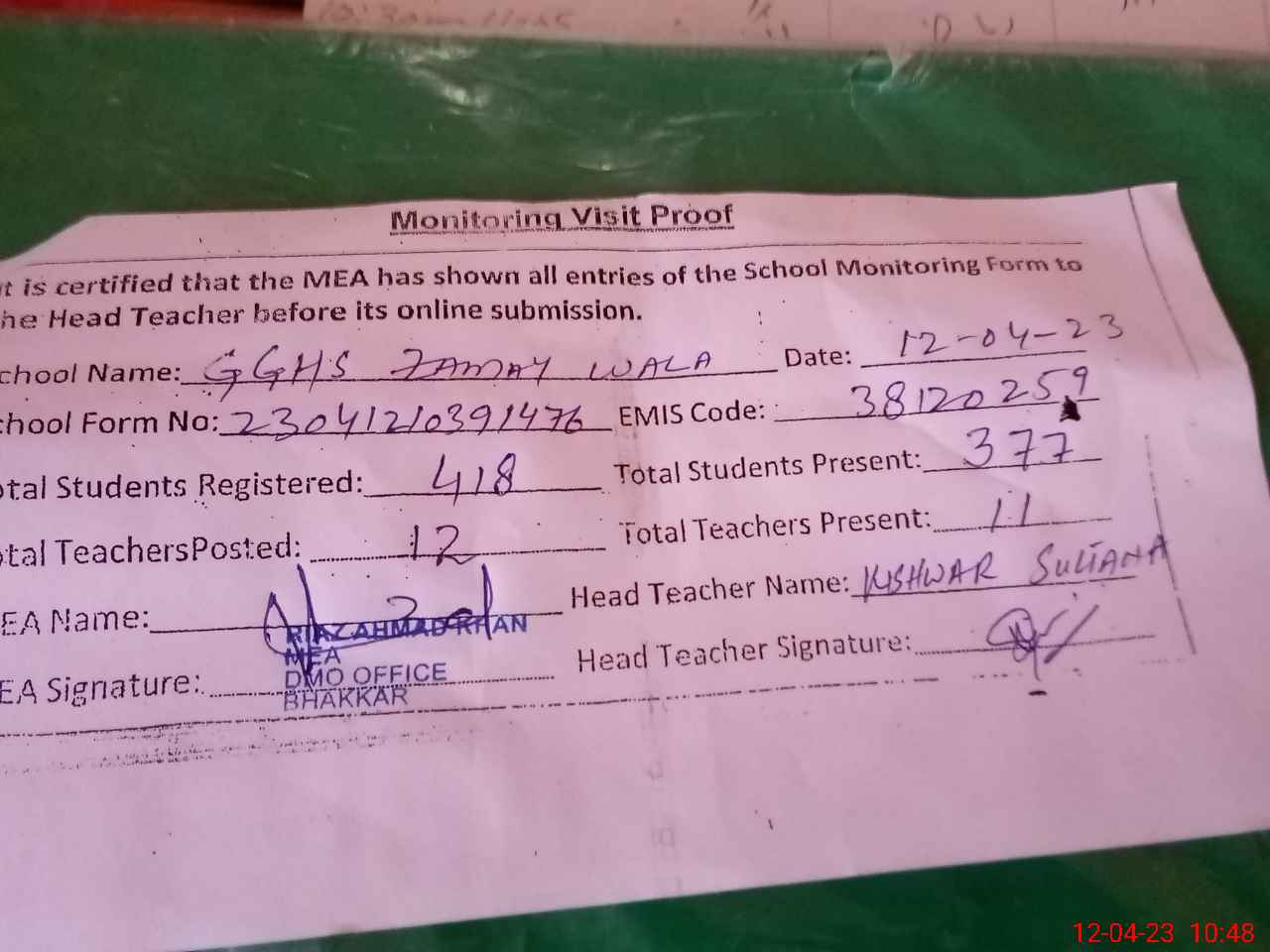 | Attendance Register | Head Teacher | MEA with School | Visit Proof |