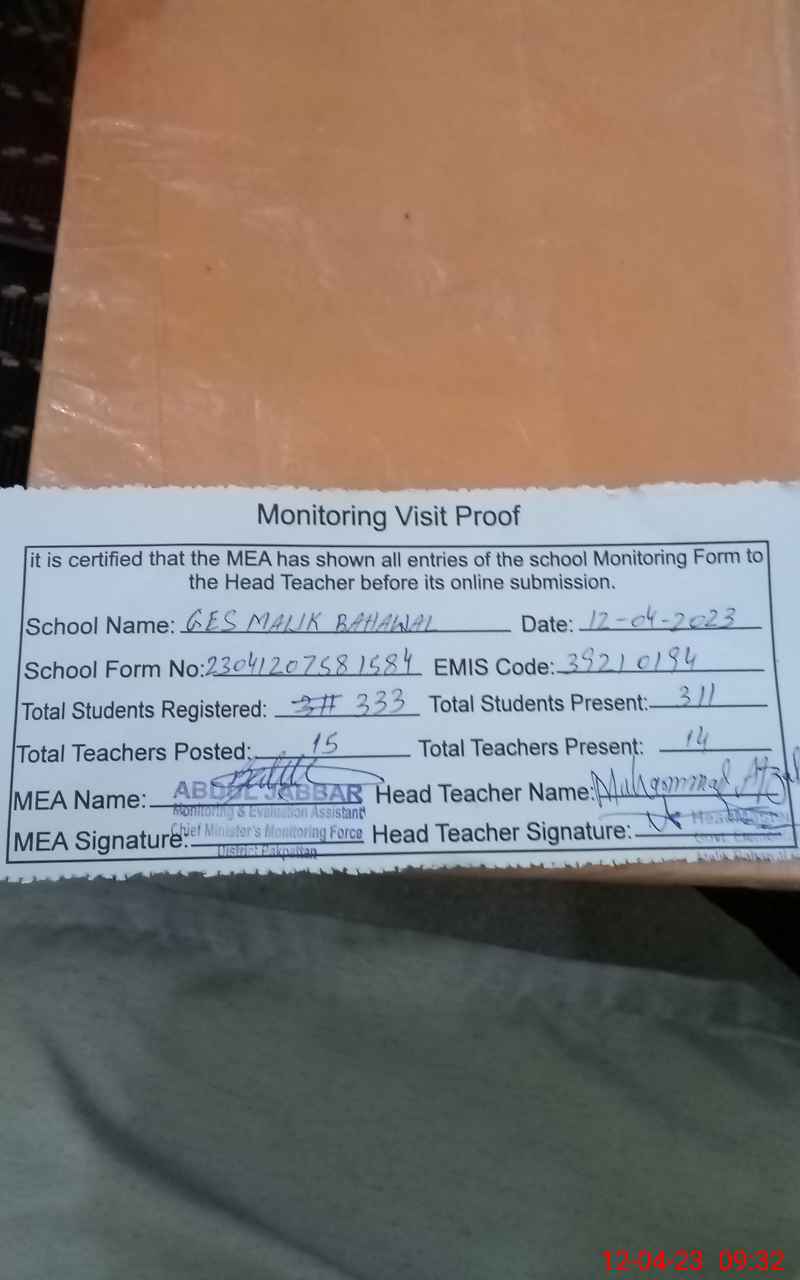 | EMIS Code: 39210194 | Name of School: GES MALIK BAHAWAL PO PAKPATTAN | |||