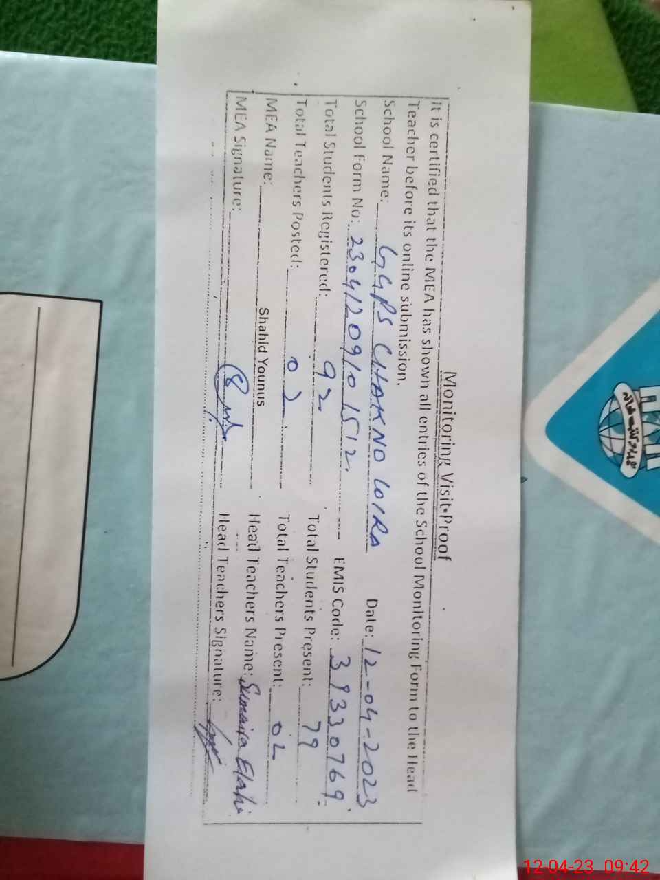 | Attendance Register | Head Teacher | MEA with School | Visit Proof |