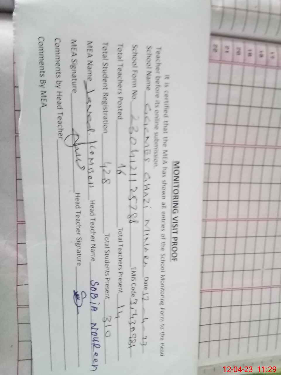 | Attendance Register | Head Teacher | MEA with School | Visit Proof |