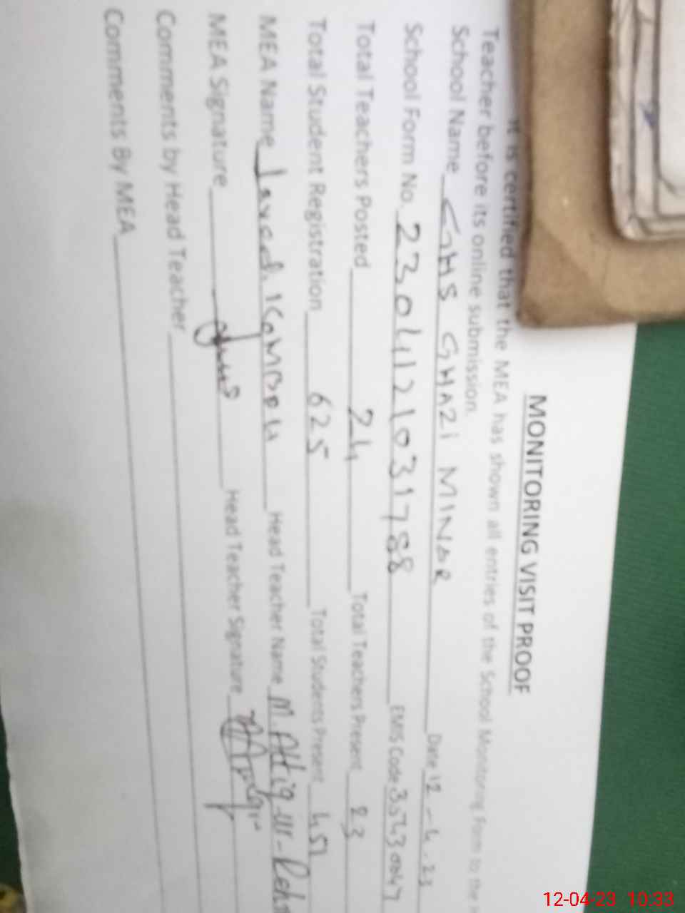 | EMIS Code: 35430047 | Name of School: GHS GHAZI MINARA SHEIKHUPURA | |||