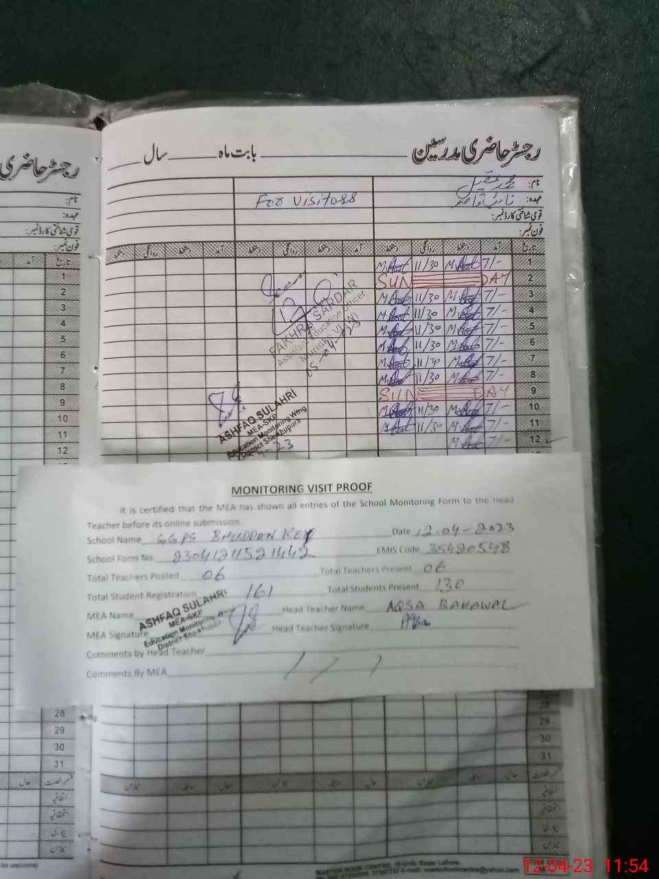 | Attendance Register | Head Teacher | MEA with School | Visit Proof |
