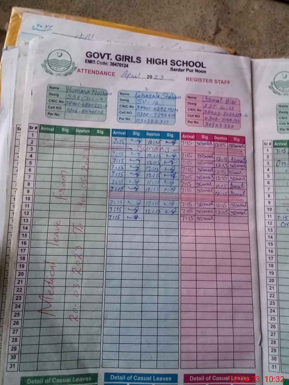 | CNIC | Full Name | Designation | R/C | Absence During Last Calender Month |