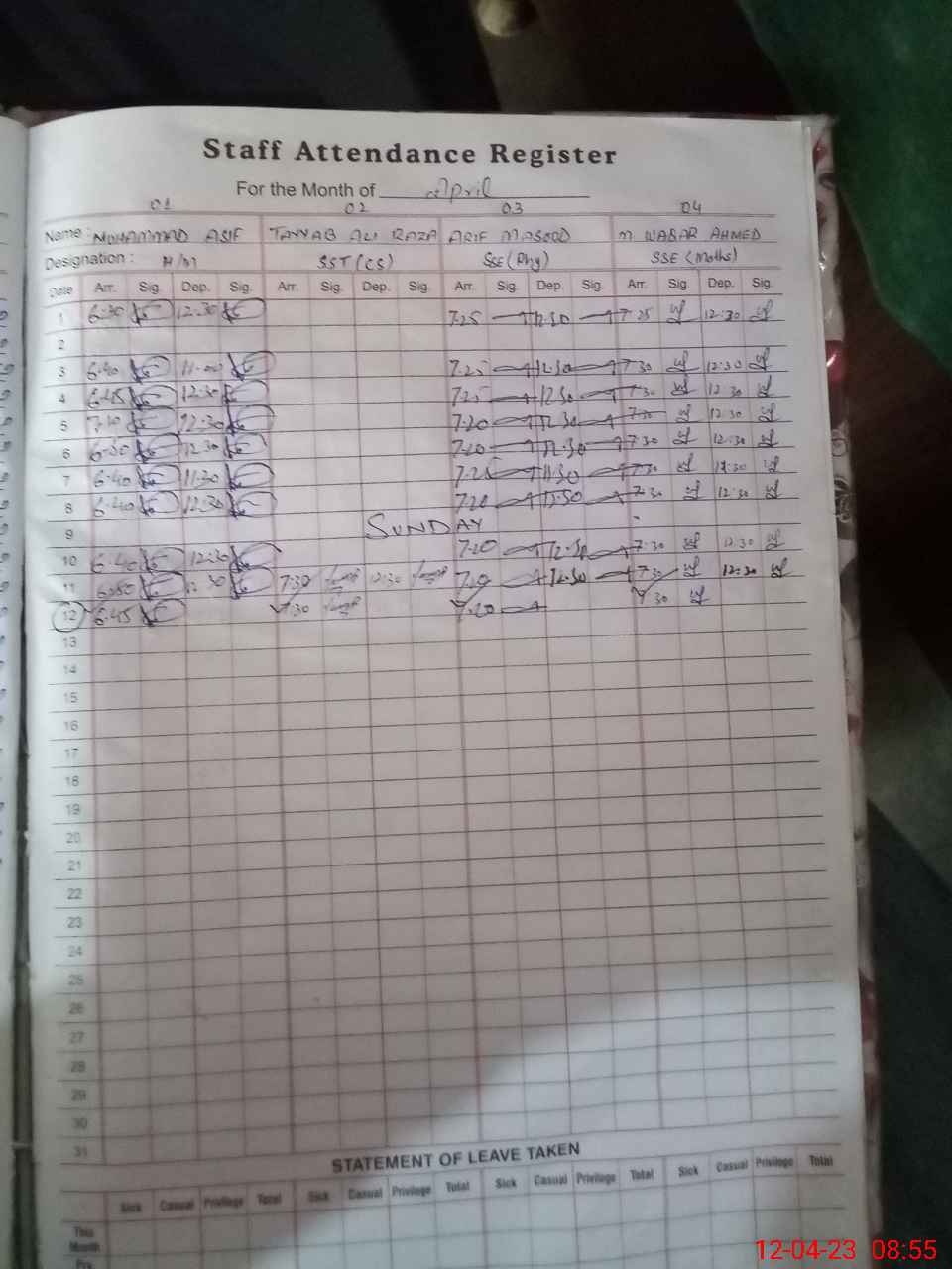| Monitoring Date: 12-04-2023 | Start Time: 12-04-2023 08:03 AM | End Time: 12-04-2023 08:59 AM | Name of MEA: Za**** Ab**** | |