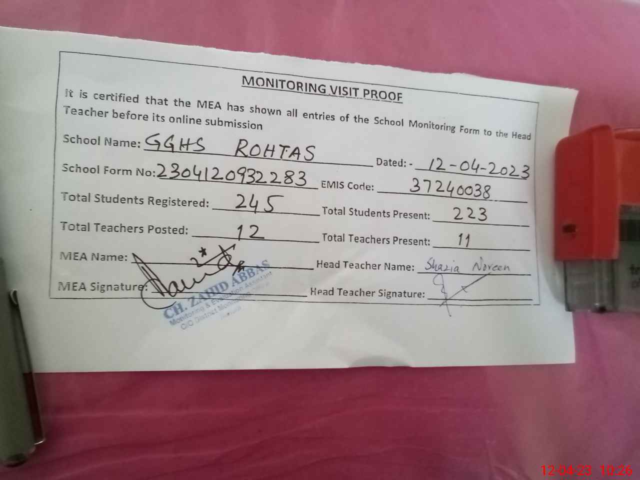 | EMIS Code: 37240038 | Name of School: GGHS ROHTAS | |||