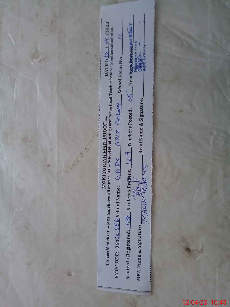 | EMIS Code: 38420656 | Name of School: GGPS AZIZ COLONY | |||