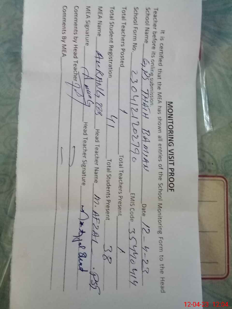 | Attendance Register | Head Teacher | MEA with School | Visit Proof |