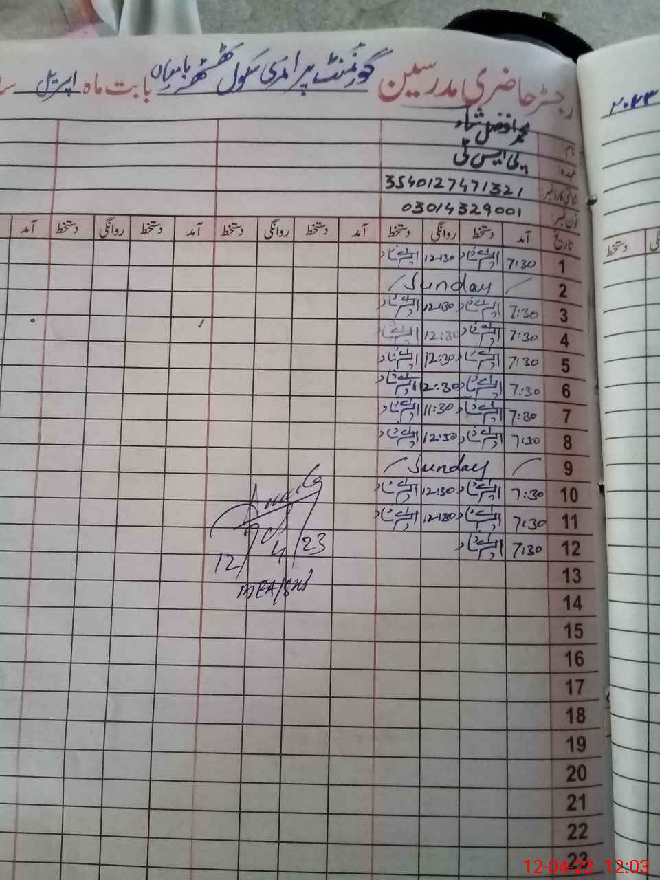 | Name: M.AF**** Designation: (School Headmaster's/Headmistress's) PTC/JV Phone/Cell Number: 03**** |