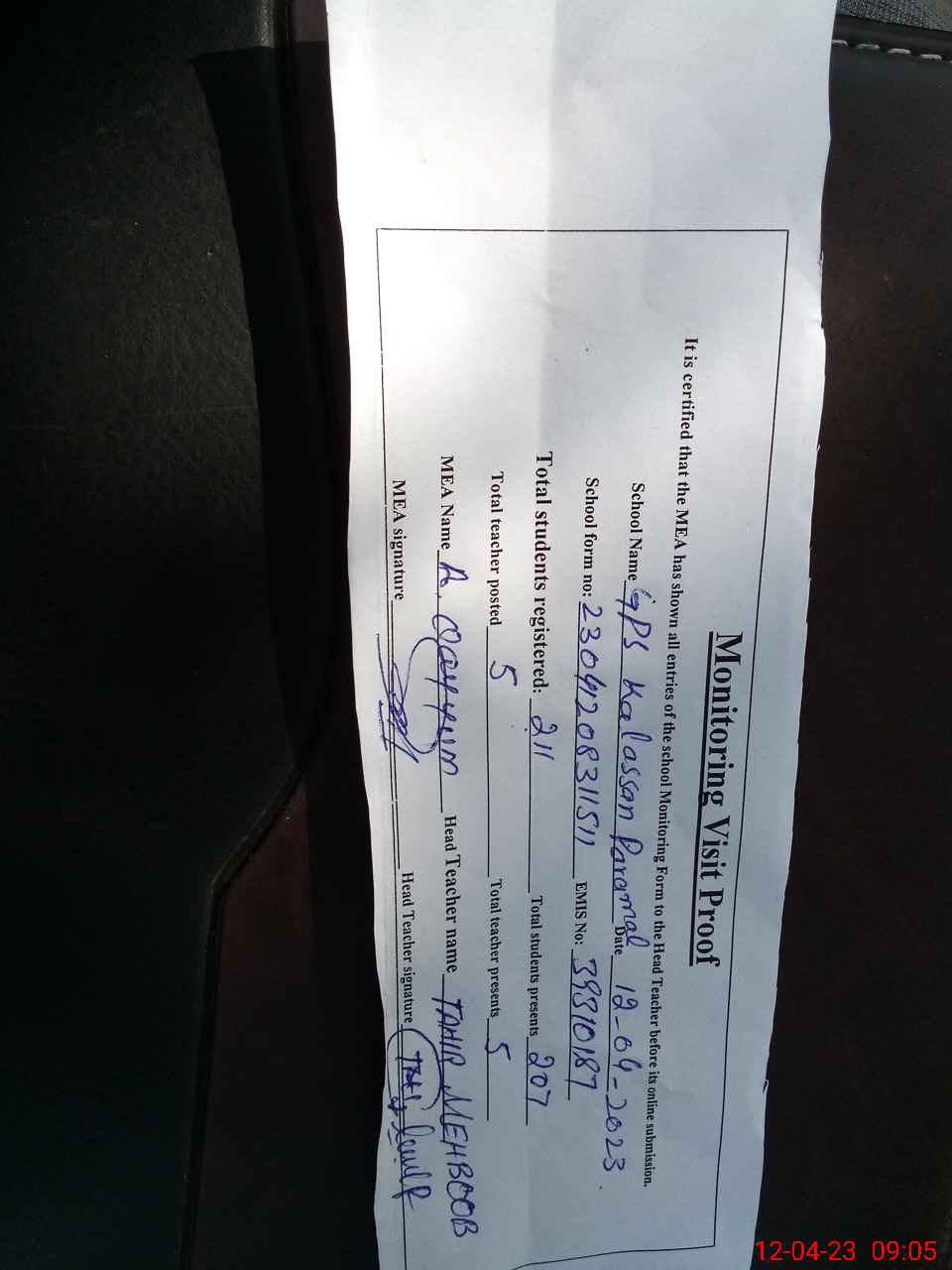 | Attendance Register | Head Teacher | MEA with School | Visit Proof |