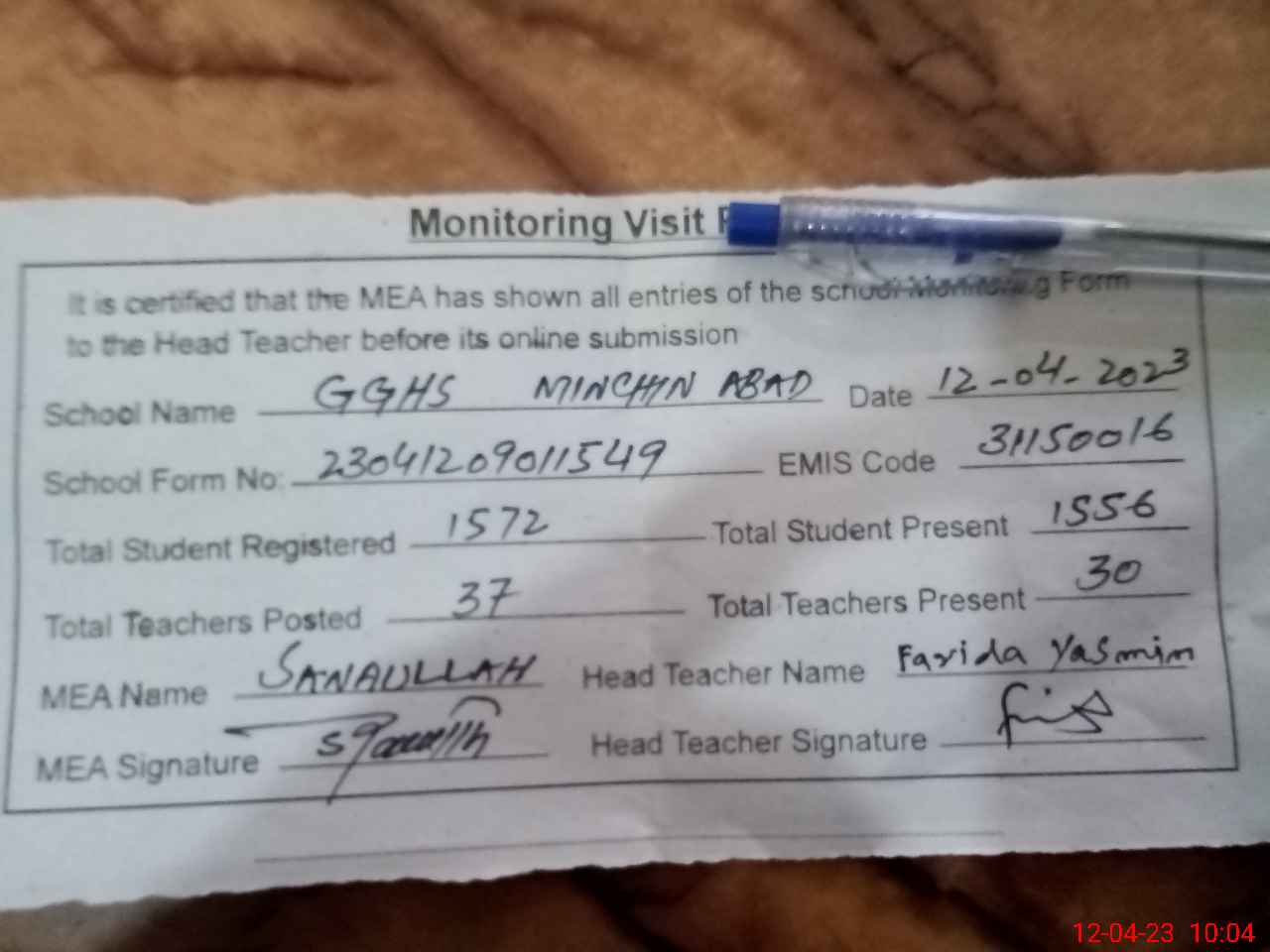 | Monitoring Date: 12-04-2023 | Start Time: 12-04-2023 09:00 AM | End Time: 12-04-2023 10:15 AM | Name of MEA: Sa**** | |