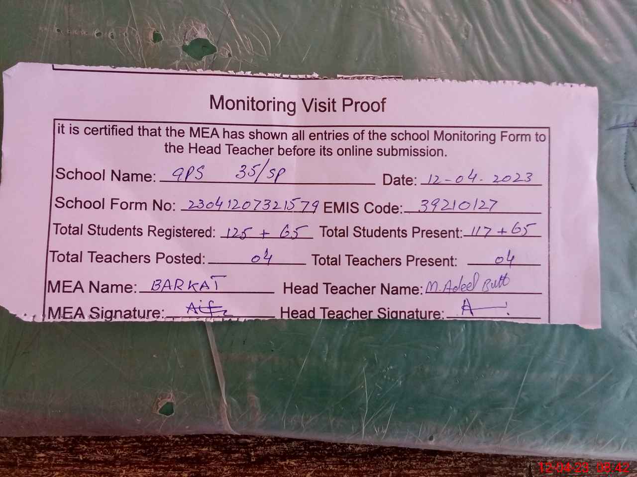 | Attendance Register | Head Teacher | MEA with School | Visit Proof |