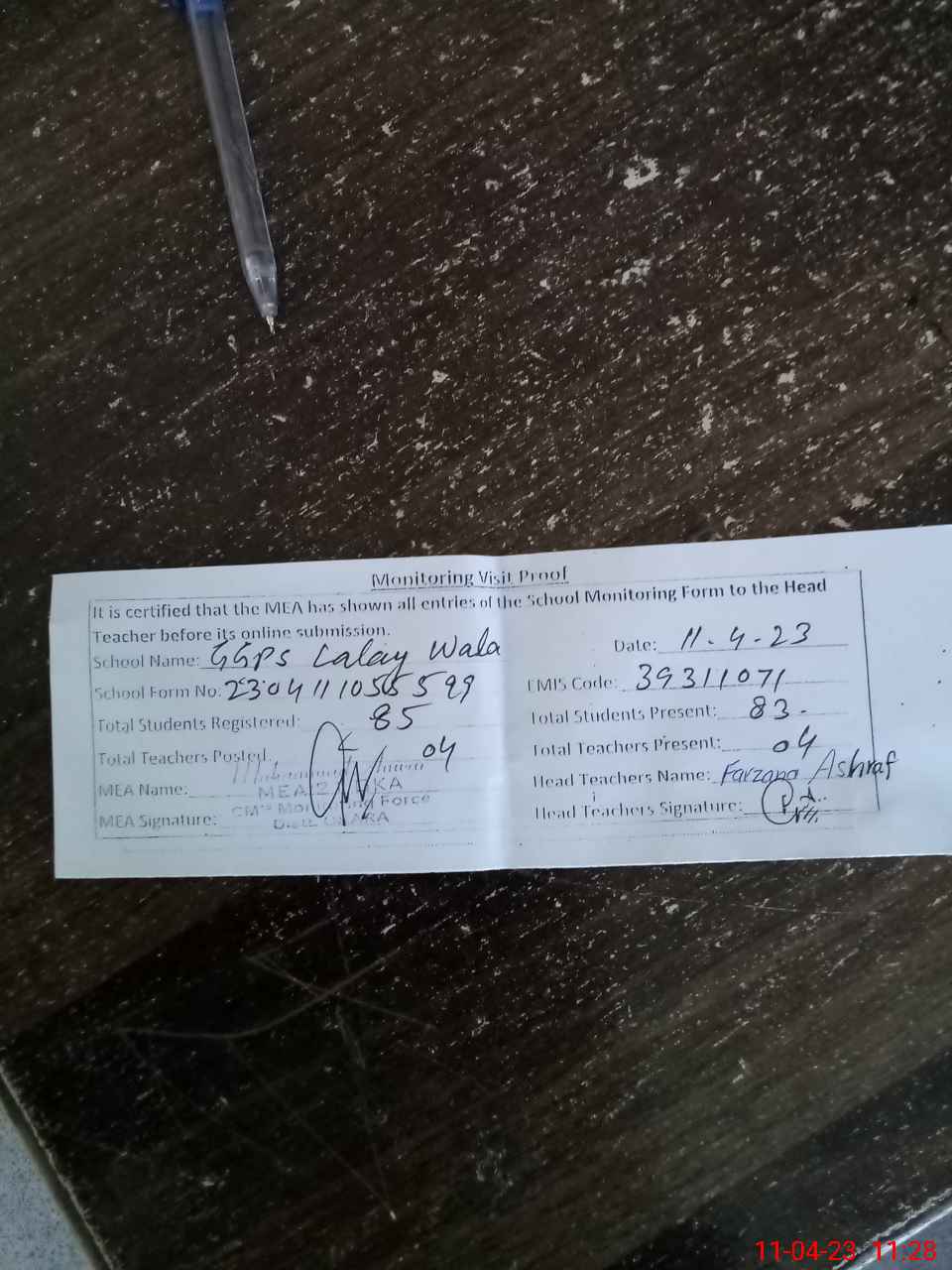 | Attendance Register | Head Teacher | MEA with School | Visit Proof |