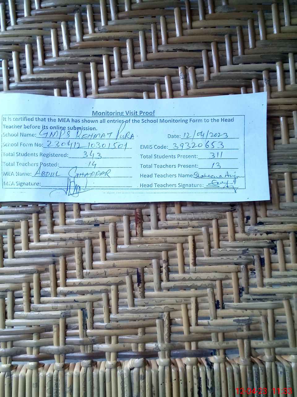 | Attendance Register | Head Teacher | MEA with School | Visit Proof |