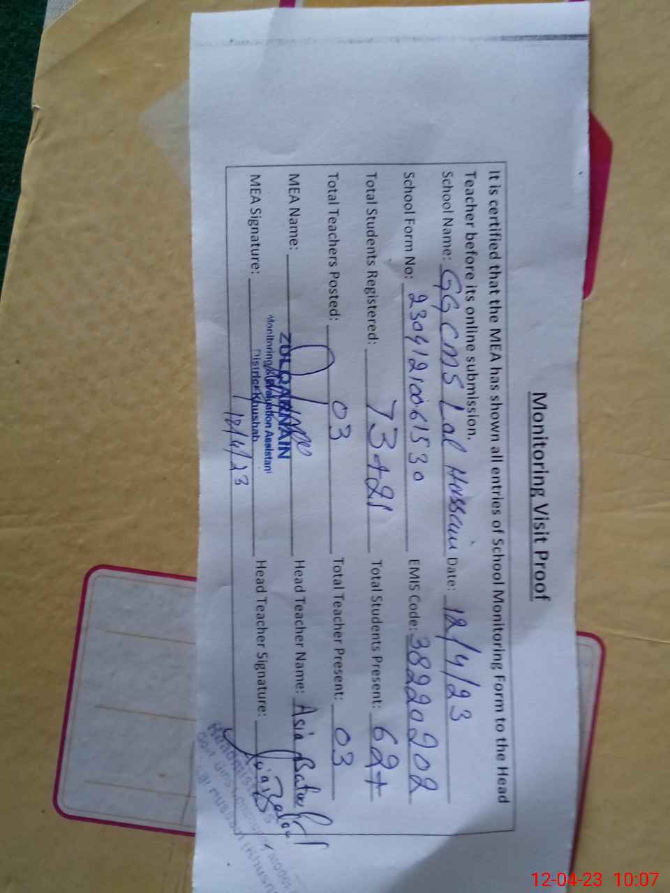 | Attendance Register | Head Teacher | MEA with School | Visit Proof |
