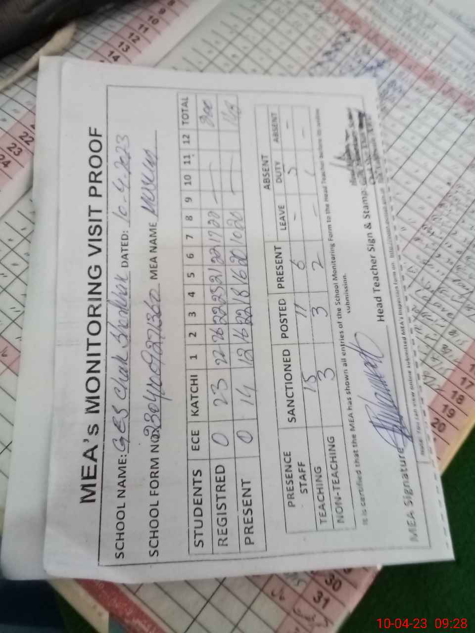 | Attendance Register | Head Teacher | MEA with School | Visit Proof |