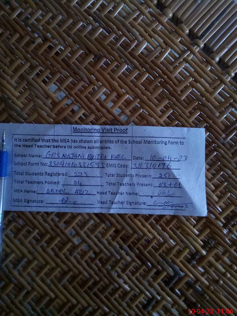 | EMIS Code: 38310176 | Name of School: GPS MAJANI QUTBI KHEL | |||