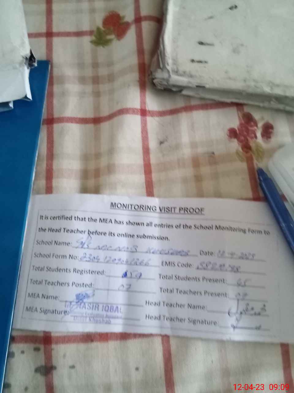 | Attendance Register | Head Teacher | MEA with School | Visit Proof |