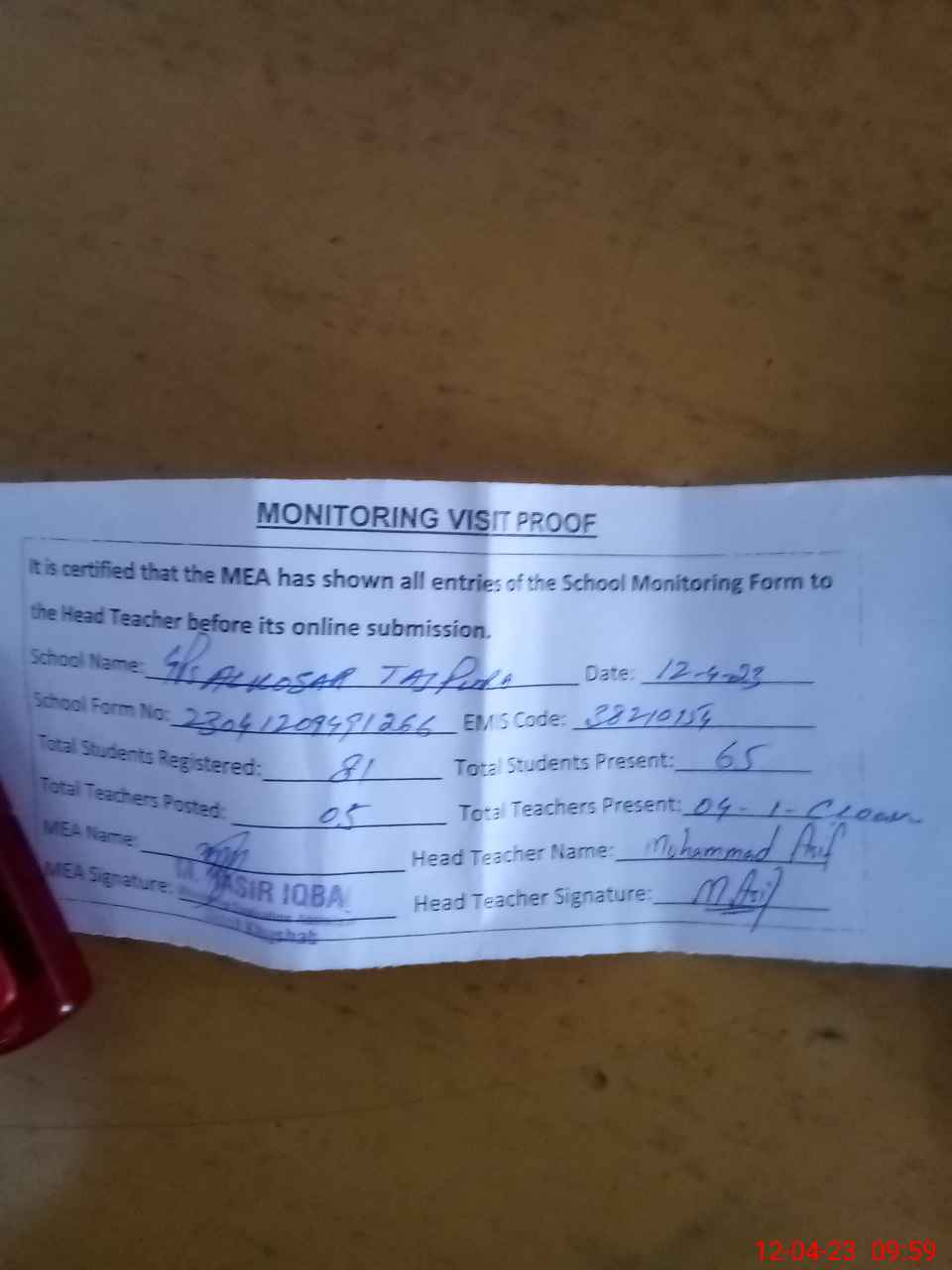 | Attendance Register | Head Teacher | MEA with School | Visit Proof |