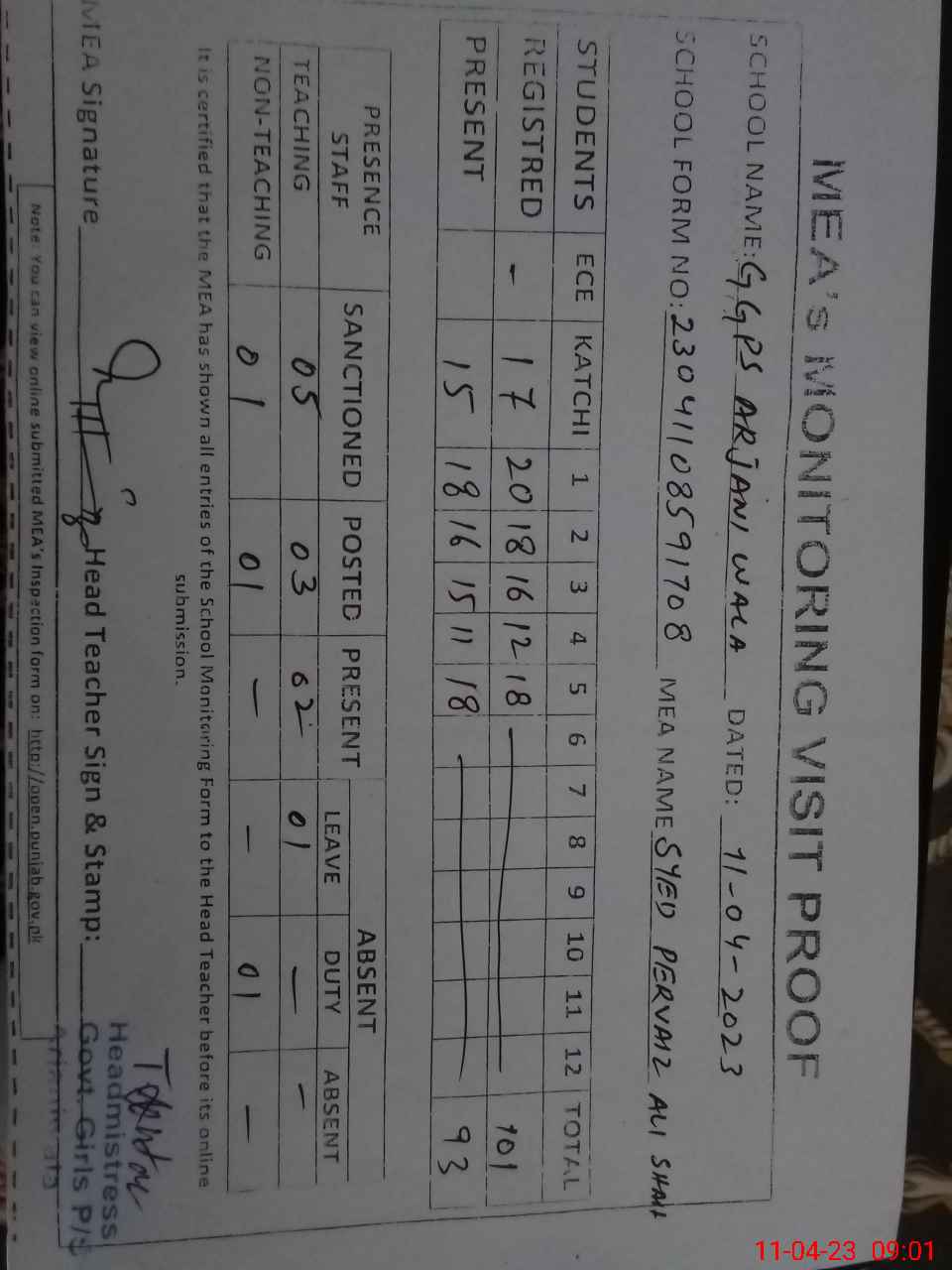 | Attendance Register | Head Teacher | MEA with School | Visit Proof |