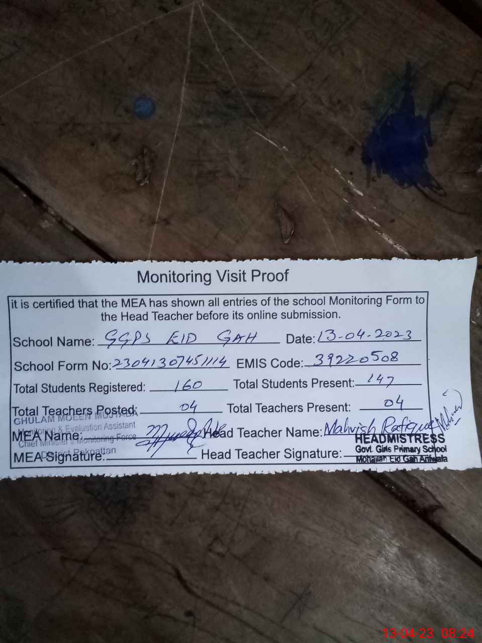 | Attendance Register | Head Teacher | MEA with School | Visit Proof |
